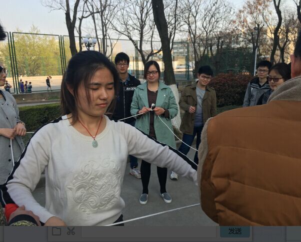 活动伊始,薛老师让每一位参与者手牵手围成一个圈,这看似平淡的举动却让在场的学生们“羞于伸手”。在接下来的“微笑握手”和“橘子苹果”、“男神女神”环节中,大家慢慢融入到了温馨的气氛中,牵手也成了彼此之间和谐的音符;随后,紧紧围在一起的大家做起各种游戏,如“炯炯有神”、“滚雪球”、“马兰花开”、“松鼠大树”、“鸡蛋小鸡凤凰”等,更有后者双手搭在前者肩膀上、几十人合跳兔子舞的游戏,欢快的舞步活跃的气氛使得每一个人逐渐体会到了团队的乐趣。随着活动的深入,一场信任之旅渐渐展开,“分家”后产生了五个小组,每个小组又同时进行了“信任背摔”、“盲人正方形”的游戏,大家运动着集体的智慧,紧紧凝聚在一起感受团队的力量。在最后一个环节“搀扶盲人”中,同学们随机列成两队,其中一人闭上双眼由身边的人搀扶着走过一段旅程,接着信任又在彼此之间传递。最后,大家围坐在一起,是玩累了或是玩饿了,可这些都已不重要,每一个人都深刻地感受到了这个团队的温暖与力量。