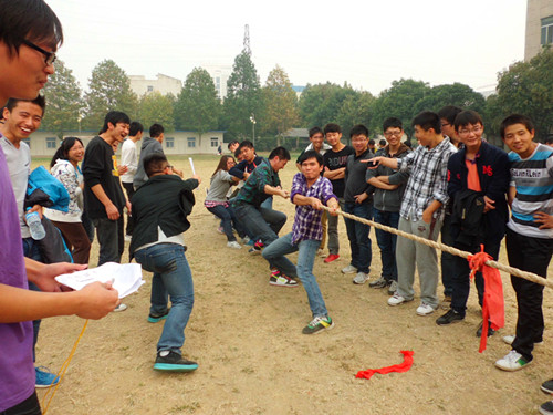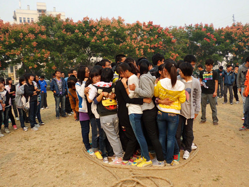 趣味运动会的第一个活动是“孤岛危情”,在相同大小的圆圈内,挤入最多成员的小队即能获胜。学生会凭借从各班集合的精英,以47人的成绩取得首胜。接下来的活动渐渐将运动会引向了高潮。拔河拉锯战惊险万分,绳上红绸在边界内不断地徘徊,一旁呐喊助威的同学捏足了汗;妙趣横生的五人六足,一不小心便有同学跟不上队友的步伐,待到拐点时大家更是跌跌撞撞;螃蟹运球时,同学们搞笑的姿势让人忍俊不禁。
