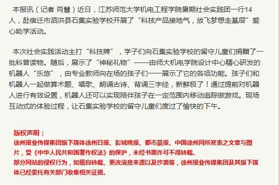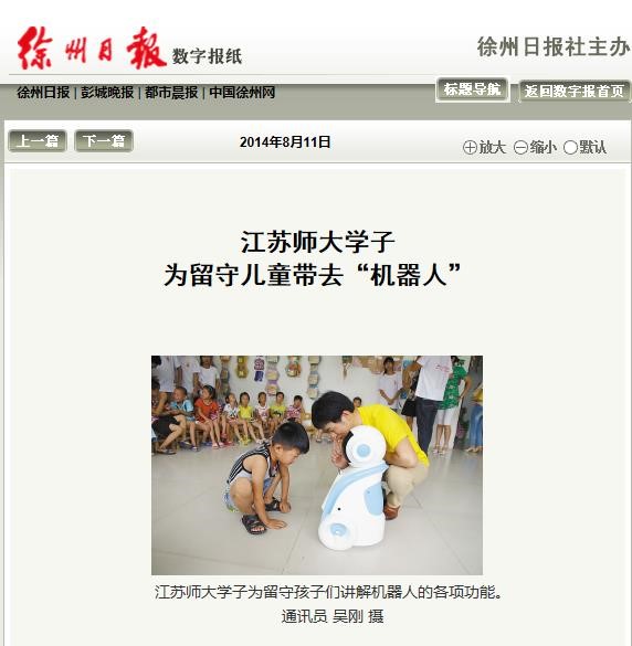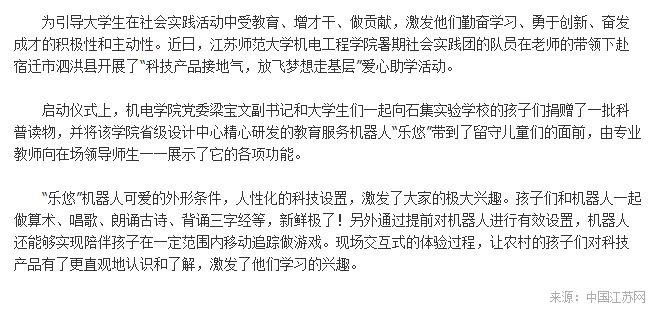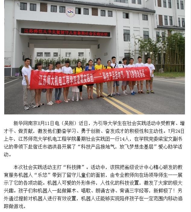 根据团苏师大委﹝2014﹞19号《关于开展2014年大学生志愿者暑期文化科技卫生“三下乡”社会实践活动的通知》文件的要求,机电工程学院于7月底前往宿迁市泗洪县开展了“科技产品接地气,放飞梦想走基层”关爱农村留守儿童爱心助学活动,把“教育服务机器人”带到了广大留守儿童的面前。