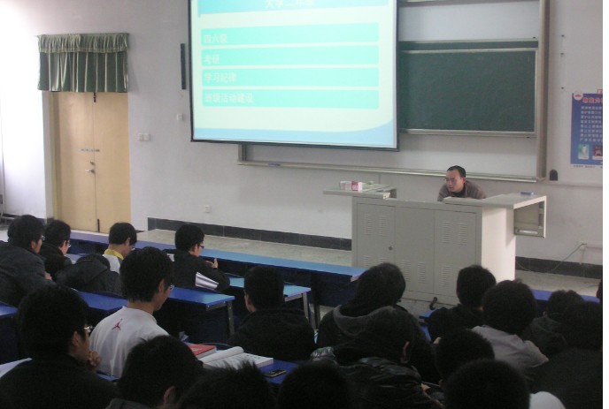 张老师首先对08级同学在去年12月份的全国英语四级考试中取得的优秀成绩表示肯定和赞赏,鼓励大家再接再厉,在接下来的六级考试中也同样取得辉煌成绩。大二已是大学的一半,张老师勉励大家学好自己的专业,规划好自己的人生,引导准备考研的同学开始着手安排学习计划,并给大家详细介绍了近几次工科学生的考研情况。另外,张老师还教育大家要提高纪律意识,不迟到不早退,养成良好的学习习惯。在业余时间尽量多参加一些实践活动,提高自己的综合素质。接下来张老师对下一阶段的学院的具体工作作了详细安排。