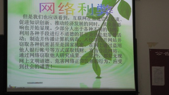 会议主要采用了PPT放映的方式,团支书为大家列举了大学校园中出现的一系列网络不文明现象,如浏览不健康网页,给他人电脑种植恶性病毒等等。经同学们相互踊跃的讨论,交流各自的看法,再由团支书总结如何更好地利用网络资源,如何更加的有利于我们身心的发展,促进我们关于网络文明认识的提高。会议最后团支书向大家发起倡议:青年大学生应当担负起建设网络文明工程的重任,积极倡导文明上网,同时也要相互宣传,使网络更加文明,做到真正的“网络文明,文明网络”。