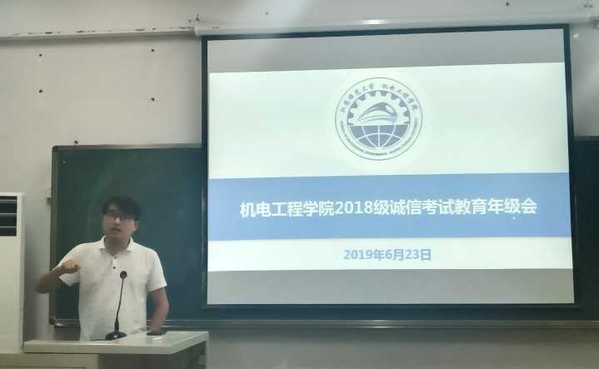 为严肃考风考纪,加强我院学生的诚信教育,2019年6月23日晚8点,机电工程学院在12#602C顺利举办诚信考试教育年级会。