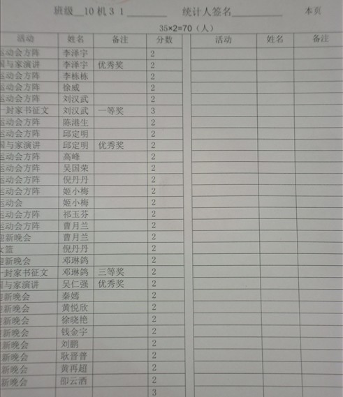 本次活动参与登记表公布主要涉及:运动会方阵,运动会基本观众,一封家书征文,国与家演讲比赛,迎新晚会等等前阶段主要活动加分情况。采用以班级为单位登记,详细的记录了每位同学的加分。
