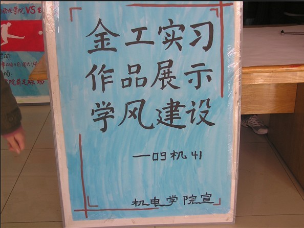 为了进一步促进机电工程学院争先创优学风建设工作的顺利开展,机电工程学院于12月10日上午,在12#楼一楼大厅展示09机41班金工实习作品——金属锤。