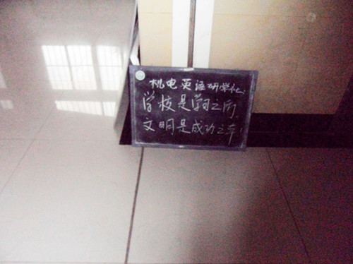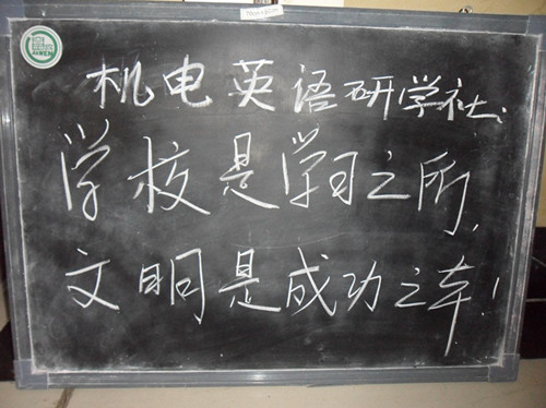 最近几个月大学英语研学社为了沿袭传统,重新以我们的“小黑板”为媒介把英语知识灌输给学生们。2011年4月初,我们积极准备资料亮出了我们的小黑板。体积虽小,但是五脏俱全,黑板内容每天不一,有名人名言也有英语小知识,更有一些新奇的内容。为了集思广益,我们鼓励社团成员开动脑筋,展开头脑风暴。4月到6月是机电学院的“文明修身工程月”,为了支持院团委的活动,我们把原本的“英语”的内容转变为“文明”的内容,我们开始把精挑细选的文明标语写在小黑板上,以警示路过的学生。我相信我们的小黑板一定程度上提醒了同学们,也为机电学院的文明修身工程做出了恰到好处的宣传作用。