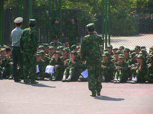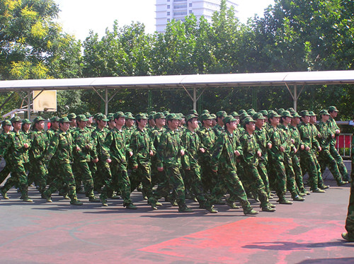 训练场上,嘹亮的口号,整齐的步伐之后,同学们拉起了军歌。只见班与班之间互不相让,一句句叫阵的妙语引来一阵阵热烈的欢呼。突然,两个班级的教官走到了各自方阵的前面,原来是两位教官见同学们拉得起劲,心痒难耐,竟亲自带起了头向对方叫阵,这一下,同学们更加卖力了。没过多久,只听见响亮的歌声此起彼伏,大家都开始享受这军训过程中最美好的时光了。