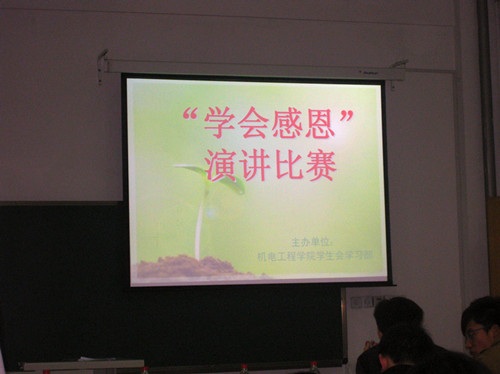 比赛于晚上7点整准时开始,学生会主席及各部部长担任了本次比赛的评委。第一轮是选手自备稿件,进行关于“感恩”的演讲。第一位选手是52班的孙祖策,可能是因为第一个上台的选手,有点紧张,不过还是成功地完成了演讲,赢得了观众们鼓励的掌声。接下来的选手们紧扣“感恩”讲述了我们应对父母、老师、朋友以及我们周围的每一个人充满感恩。第二轮的比赛是选手随机抽选题目进行即兴演讲。其中41班的李林玉很从容地把自己对弟弟的爱很透彻的表现了出来。第二轮比赛结束后,学生会主席周健上台指出了选手们的一些优点与不足并宣布了比赛结果。