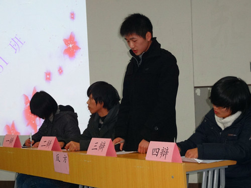 本次辩论赛共分为两场:11机31 VS 11机51 和 11机41 VS 11机52。第一场辩论主题——愚公该移山,还是搬家?正方31班支持愚公移山。他们认为愚公搬家是自私的,是在逃避,只有搬山才具有奉献精神,才能为社会提供广阔的发展空间。而反方51班则主张愚公搬家。他们认为愚公搬山劳民伤财、费时费力、破坏环境,完全不切实际。相反,搬家才能适应社会,才能以灵活变通的方法妥善解决问题。辩论双方观点明确,互不相让,一场精彩的舌战就此上演。第二场亮相的是正方41班与反方52班,他们的辩论主题是:酒香怕不怕巷子深。正方坚持认为酒香不怕巷子深,而反方却表示酒香也怕巷子深。同样,参赛双方你来我往,在这场语言的战场上谁都无法说服对方。在比赛过程中,最精彩的莫过于双方一对一攻辩与自由辩论。辩手们犀利的言语直指对方的漏洞,频频使得对手措手不及。观众席上不时响起的阵阵掌声与欢呼是对辩手们最大奖励与支持。而每场比赛最后的观众互动环节也为场上其他同学提供了展示自我的机会。他们深思熟虑之后的问题,往往能一针见血地刺中对方要害。