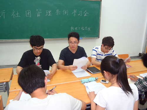 5月7号晚上7点,机电工程学院的学生会,英语研学社,微尘青年志愿者等部门的主要负责人在工学院101c教室举行“新社团管理条例例会”。