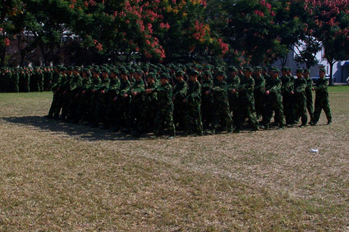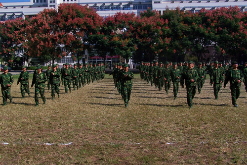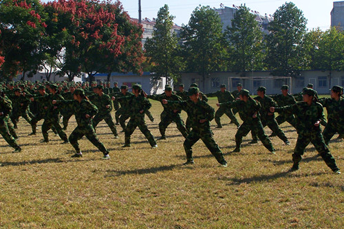 在简单进行了最后一次彩排后,同学们用嘹亮的拉歌声迎来了我院各级领导。军训会操也正式拉开了帷幕。最先,院长对我院新生进行了阅兵。接着,我院新生出色地完成了四面转法、正步走、军体拳等会操演出,向院领导详细展现了他们半个月来的军训成果。他们整齐一致的步伐,斗气高昂的军体拳,嘹亮的口号都给在场人员留下了极为深刻的印象。会操结束后,同学们不得不惜别将要离开的教官。经过半月的相处,同学们与教官早已建下了深厚的情谊。看着同学们不舍的泪水,教官真心祝愿同学们能在大学里好好学习,健康快乐!