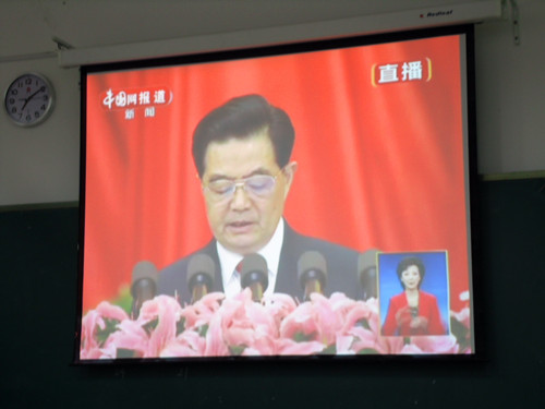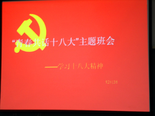 本次班会由班级团支书李琪同学主持。班会之初,主持人展示了我国现今的历史背景,让同学们了解了当今的经济、政治、文化、社会形势。而后是十八大的图片欣赏,并播放了胡锦涛主席的退职演说,同学们更加透彻地了解了党的历史和当今的社会形势。随后,班会进入了第二个环节,各个班委依次发表了对十八大的个人感受,更加拉近了十八大与同学们的距离,让同学们感受到了十八大与生活息息相关。班会的最后一个环节是十八大知识竞赛,全班同学共分为两组,由主持人放映题目,两组抢答,最终回答题目正确数多者为胜,胜者有糖果奖励。竞赛题目一出,气氛立刻活跃起来,同学们争相竞答。比赛在竞争中到了尾声,与此同时此次班会也在一片掌声中圆满结束。