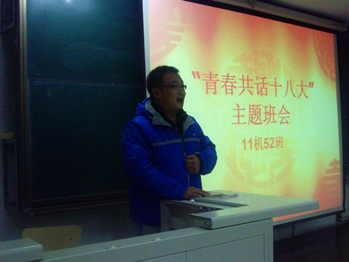 为了让同学们深入了解十八大内容,认真学习十八大精神,机电工程学院11机52班于12月12日晚7点30分在8号楼J103举办以“青春共话十八大”为主题的班会。班级团支书刘迪同学担任主持,班主任巩东超老师也出席会议。