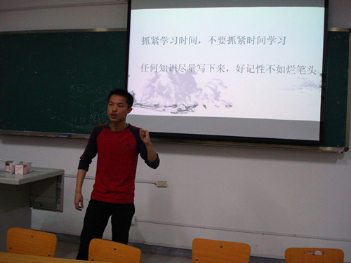 同学们对本次交流会的期盼很高,活动首先由张松学长发表了演讲,他向同学们讲解了与人相处的宝贵经验,并告诫我们要努力提高思想觉悟。接着,10机52班的黄鑫学长分别从英语和C语言与同学们进行了经验交流。其独特的学习方法让同学们受益匪浅。接着,袁媛学姐与同学们全面交流了她的学习心得。而她对于专业课的学习理念更是让为专业学习而苦恼的同学们眼前一亮。本次交流会最精彩的莫过于钟艺诚学长一番激情四射的演讲。他演讲的主题是社团与学习和谐共进。他告诫同学们要“抓紧学习时间,不要抓紧时间学习”。同时,他通过几组数据向同学们展示了现实的残酷以及竞争的激烈。他说:“不要觉得不可能,试过之后才知道。”