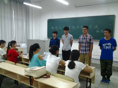 学生会初试定于下午一点正式开始,同学们早早的来到准备室等待,教室里布满了紧张、略带羞涩的面庞,各部门部长也在积极地准备面试问题。面试开始,同学们井然有序的进入教室,在郑重地递交完报名表后,首先作简要的自我介绍,接下来回答部长们提出的问题,这也是全面考察他们能力与工作态度的时刻。第一轮面试结束,各位部长们都对前来面试的同学进行了初步的考核,紧接着,秘书部、新闻部、外联部、文艺部进行了复试,这一轮是对本部门专业技能的考核,外联部的辩论赛进行的尤为激烈,他们以“网络用语是丰富还是污染了我们的生活”和“大学生该不该找兼职”为话题展开辩论。