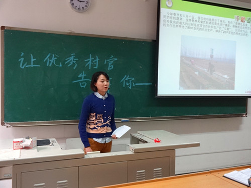 紧接着,我校毕业的优秀大学生村官惠子为同学们介绍了我省各地区社区构成,阐明了社区工作的宗旨—全心全意为居民服务。她列举了社区开展的便民服务活动,如孤寡老人送温暖、法律援助服务台等社会公益性活动。她还就大学生村官的日常工作与职责、未来的发展前景与出路和同学们展开讨论。