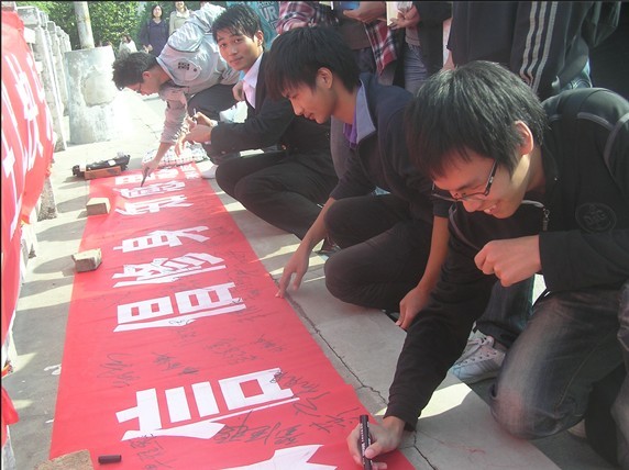 积极响应团委关于开展“校园廉洁文化活动周”通知的号召,机电工程学院09411022号中午,在玉河上举“讲诚信倡修身知感恩”签名活动。本次活动受到同学们的大力支持。