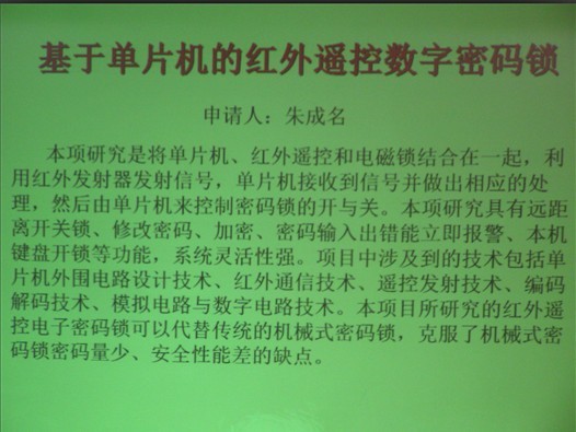 本次评选会共有25个项目参加评选,涉及日常生活智能化、生产设备的零件改进、财务安全防范等方面。评选过程中,各项目的申请人简要介绍了项目构思、实现过程及成果提交形式等,各评委老师分别针对各项目的不同特点,对其可行性等主要方面进行了细致的提问。值得一提的是此次评选会同学们积极踊跃的参与赢得了老师们的一致好评。