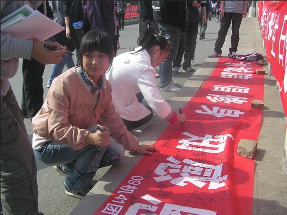 积极响应团委关于开展“校园廉洁文化活动周”通知的号召,机电工程学院09411022号中午,在玉河上举“讲诚信倡修身知感恩”签名活动。本次活动受到同学们的大力支持。