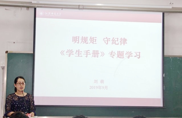 为帮助新生进一步了解学校相关规章制度,9月9日下午2:00,我院在12#603C为新生开展了学生手册专题学习,辅导员刘萌老师为2019级全体新生做了题为“明规矩,守纪律”的专题讲座。