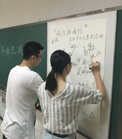 接着,在马老师的倡导下,毕业生们积极响应“诚信伴我行”贷款毕业生签名活动,签名代表了同学们对诚信还款的承诺。