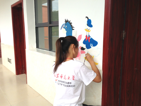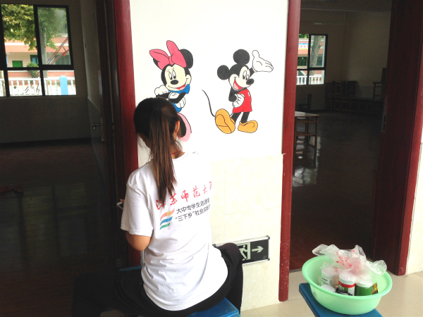为了给孩子们一个惊喜,队员们往返3个小时下山买来画笔和颜料,由于条件有限,只买到了红黄蓝绿四中颜色。担心停水影响绘画的进度,队员们用水桶从村民家里抬来备用水;担心脱落的画笔毛影响墙画的美感,队员们一边画一边轻轻的挑出粘在墙上的笔毛;担心颜色太少绘出的画不够生动,队员们凭借自己的专业知识研究每一种颜色,用红黄蓝绿调配出各种美丽的颜色;担心午休影响绘画的进度,队员们只敢趴在桌子上小眯一会儿。队员们没有人喊累,因为他们知道,墙上的每一个画面都将成为孩子们珍藏在童年记忆深处的美好。