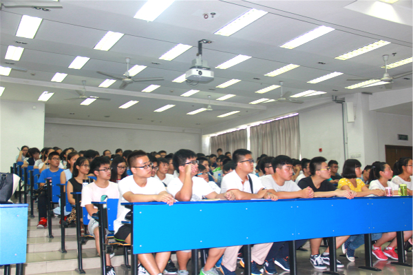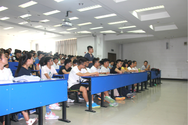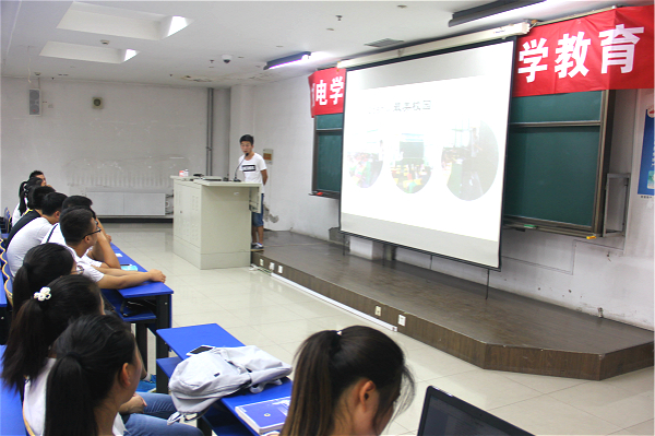 支教团成员代表、院学生会学习部部长王祎同学为新生作了支教生活的感悟分享。王祎同学从支教团的前期准备、往返路途、集体备课、课堂趣事、学生家访、特别活动等点滴说起,分享了自己的心得体会。他说到,自己很幸运在暑假的时候选择去贵州支教,有机会帮助到那些贫困山区的孩子们。支教的条件艰苦,但是没有人喊过苦,大家一起并肩作战、互相鼓励,也让他感受到了团队合作的力量。卞兆媛同学重点分享了自己组织特色活动的感受,她带领工业设计的同学利用专业特长为孩子们手绘墙画,为孩子们举办趣味运动会、文艺演出、生日party等等。她说,看到孩子们灿烂的笑容,队员们心里满满的幸福感和成就感。新生们被支教故事深深吸引和感动,认真的聆听和记录。