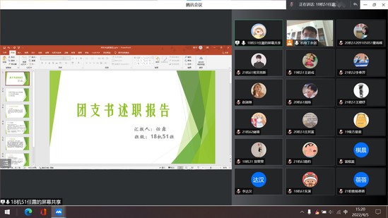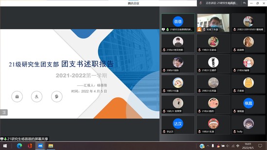 会上,各年级团支书利用PPT汇报的形式,通过支部组成、思想建设、社会实践、成果展示等方面对过去一年的工作进行了总结,汇报了2021年支部工作的开展情况、存在不足及努力方向,并结合事例阐述进行自我剖析,汇报工作的同时也交流了自己担任团支书以来的心路历程。