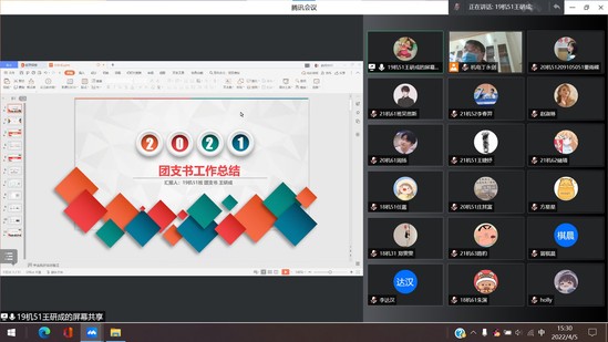 为进一步总结学院团支部年度工作开展情况,不断规范学院团支部的运行秩序,全面提高学院团支部工作活力,2022年4月5日下午3点,机电工程学院团委通过腾讯会议召开2021年度团支书线上述职工作会。机电工程学院团委书记丁永剑老师、各本科生团支部、研究生团支部支部书记以及分团委成员参加了本次述职工作会。会议由丁永剑老师主持。