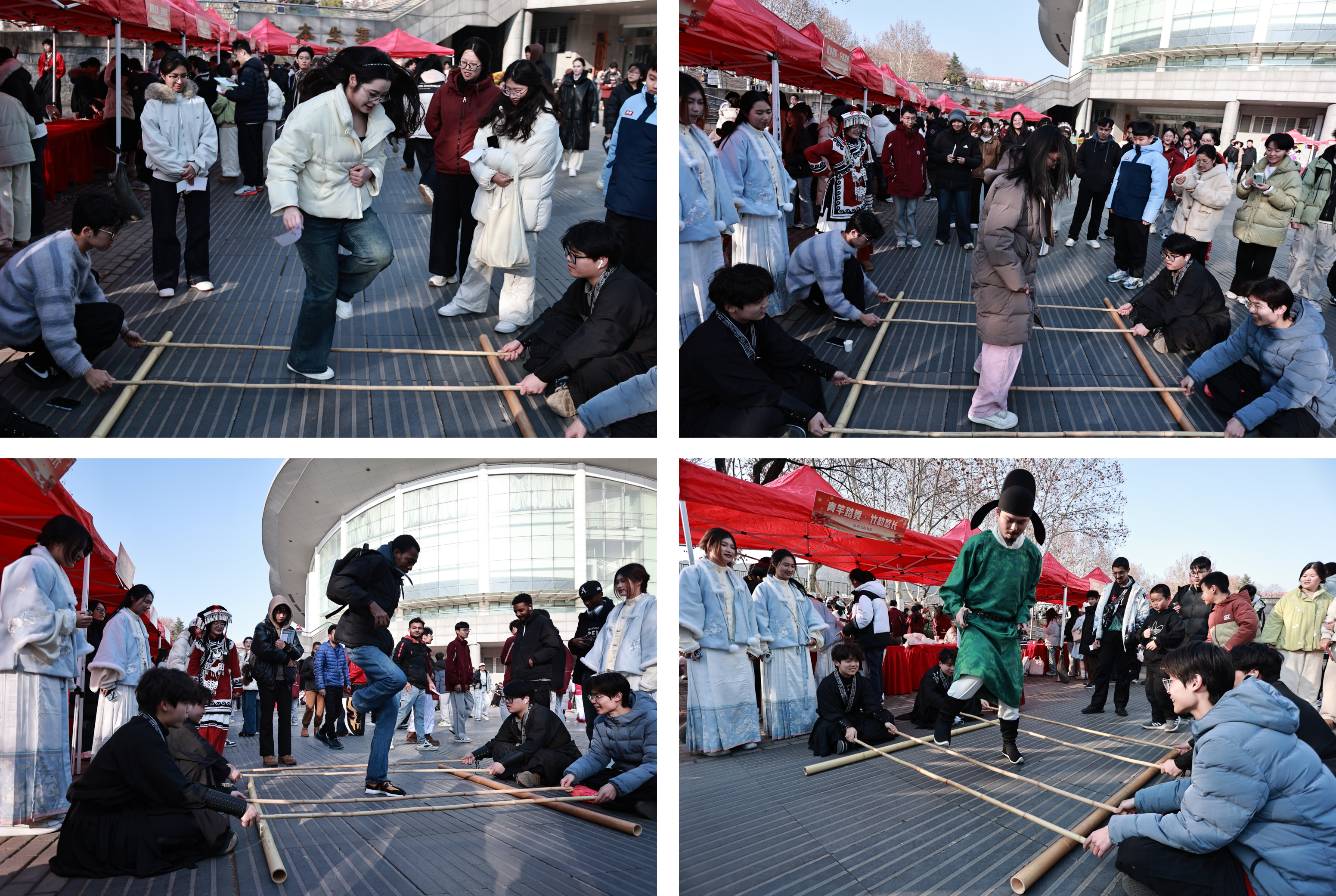 活动开始前半小时,工作人员便提前到场精心布置。随着清脆的竹竿开合声欢快响起,明快的节奏瞬间吸引了大批师生驻足,大家踊跃报名、积极参与。活动现场暖意融融,参与者们紧盯竹竿起落,认真跟随节拍轻快跃动,沉浸式体验民俗游戏的独特魅力;还有部分同学主动化身志愿者,默契配合敲击竹竿,精准把控节奏韵律,为活动有序推进保驾护航。竹竿起落间,欢声笑语此起彼伏,跃动的身影交织成校园里一道充满青春活力的风景线。