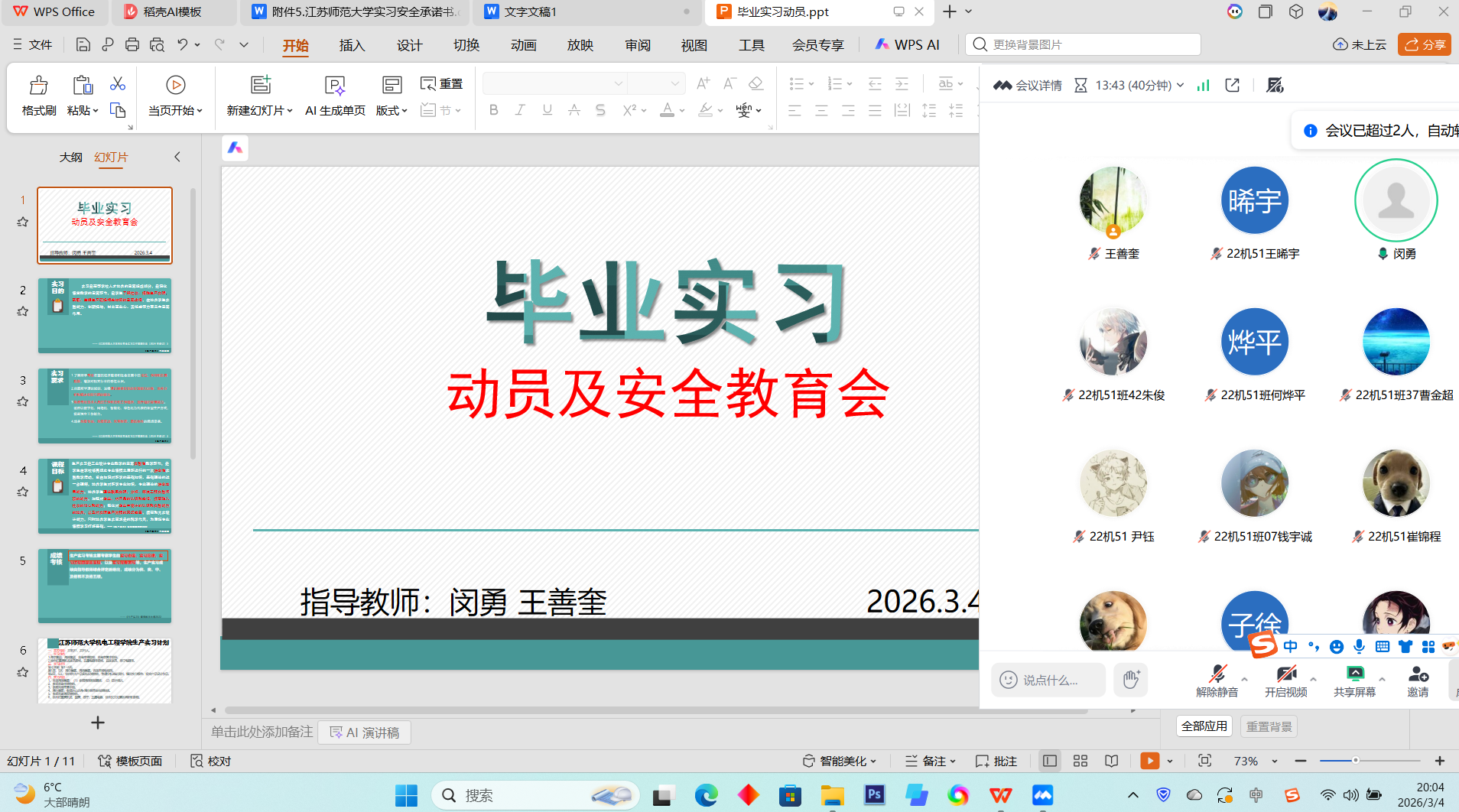 安全是实习工作的首要保障。为确保实习顺利进行,带队老师在学期末专门组织了线上生产实习动员及安全教育培训。培训中,老师结合实习内容,通过案例分析与注意事项讲解,帮助同学们明确实习任务与目标,严肃实习纪律,识别潜在安全风险,并学习相应的应急处置方法。实习开始前一周,老师再次召开线上会议,重申“安全第一、预防为主”的原则,为实习顺利开展筑牢安全基础。