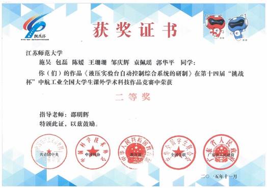 2015年获“挑战杯”大学生课外学术科技作品竞赛全国二等奖