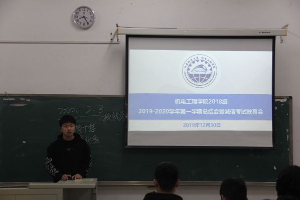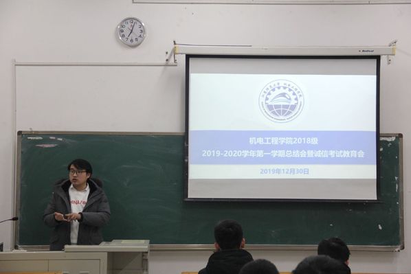 12月30日晚7点,机电工程学院2018级2019-2020第一学期总结会暨诚信考试教育会于12#101C召开,会议由学院辅导员丁永剑主持,全体2018级同学参加。