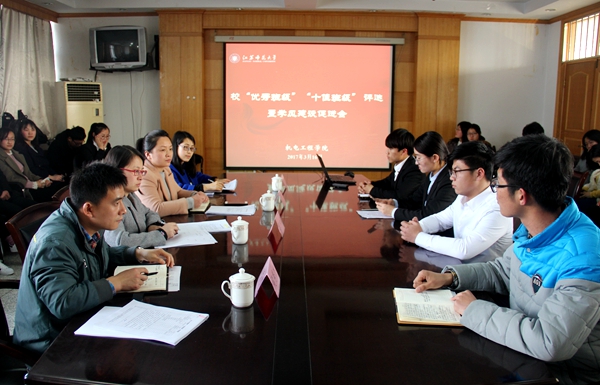 3月16日下午,机电工程学院在院会议室召开2016年度“优秀班级”展评暨学风建设促进会,校学生工作处朱和卿老师、机电工程学院党委梁宝文副书记、机电学院团委刘萌老师、侯秀杰老师应邀担任评委,14、15及16级全体学生骨干参加了会议。
