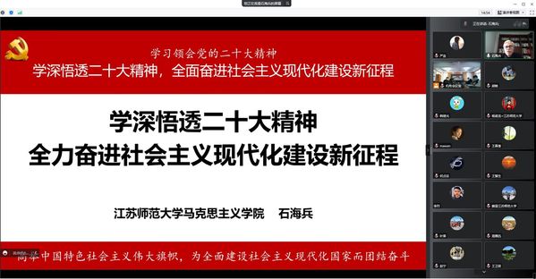 石海兵教授从党的第二十次全国代表大会的基本情况、过去五年的工作及新时代10年的伟大变革、新时代新征程中国共产党的使命任务、全面建设社会主义现代化国家、积极投身社会主义现代化国家建设等五个方面作了题为《学深悟透党的二十大精神,全力奋进社会主义现代化建设新征程》的宣讲报告,对党的二十大精神进行了全面、深入、系统的解读。石海兵教授用大量的图表、事例、数据展示了党的二十大的政治意义、理论意义、战略意义和实践意义,以及中国取得的战略成果、政治成果、理论成果、实践成果、制度成果等。