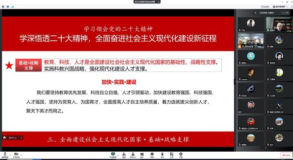 12月14日下午,机电工程学院党委举行学习贯彻党的二十大精神宣讲报告会。校宣讲团成员、马克思主义学院石海兵教授应邀作专题辅导报告,本次报告会以线上线下相结合的形式举行,会议由学院党委书记何莉娜主持,全体教职工参加。
