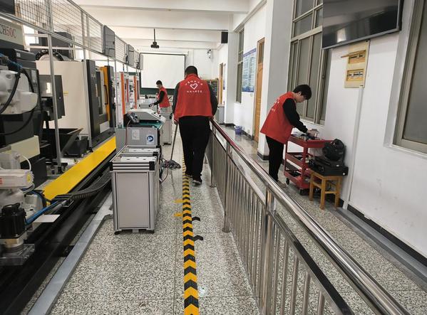志愿者们充分发扬不怕脏、不怕累的优良作风和团结协作的精神,大家按照任务分工,有序开展志愿清扫工作,志愿者们在自己区域打扫干净后仍不忘帮助其他同学,特别是那些较难清理死角较多的区域。经过两个小时的劳动,大家同心协力将一层层灰尘从有变无,为师生创造出了一个干净整洁的实训环境。