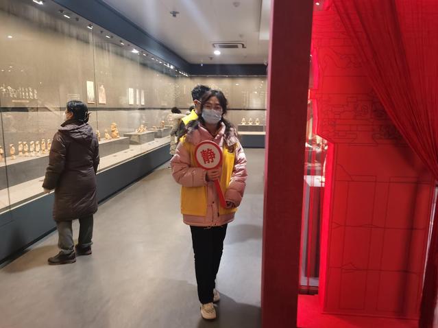 在徐州博物馆,乔绪研同学从大年初三进行了为期一周的志愿者活动。乔绪研在博物馆的工作是展厅文明引导员,活动开展位于主陈列楼六个常设展厅内,主要是引导游客不要大声喧哗,不要拍打橱窗和不要使用闪光灯拍照等,还有告知游客相关展区位置以及对博物馆基本信息进行介绍。