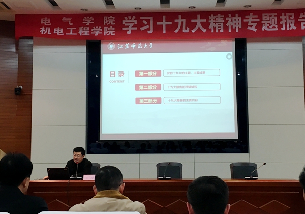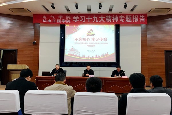 12月13日下午,校纪委王峰书记应邀在重点实验室报告厅为机电学院和电气学院全体教师党员作学习贯彻党的十九大精神专题报告。学院领导班子及全体教师党员聆听了报告。