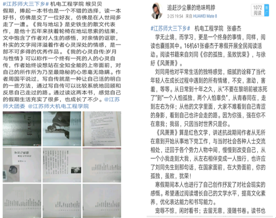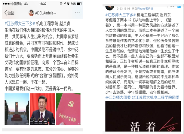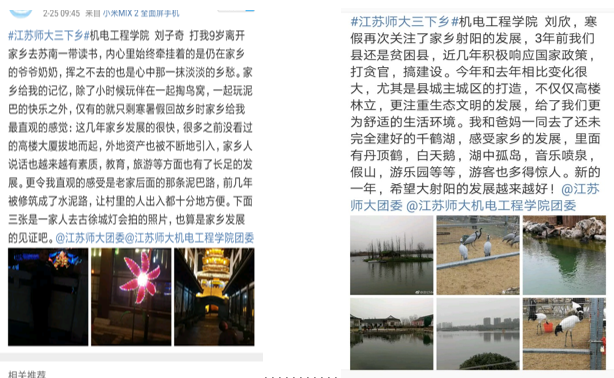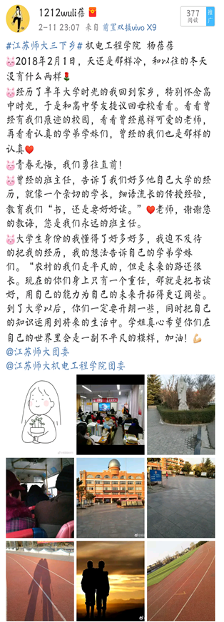 2018年寒假,我院团委按照校团委《关于开展2018年寒假社会实践活动的通知》文件要求,组织各班级学生积极响应团组织号召,根据“新时代 新使命 新思想 新征程”活动主题,围绕社会调查、志愿服务、全民阅读、专业实践、弘扬传统文化、师大学子母校行等主题开展了一系列的实践活动,在实践中受教育、长才干、做贡献,取得了丰硕的实践成果。同时,鼓励学生积极参加校团委开展的“微话实践博展青春”寒假社会实践微博征集评选活动,记录实践风采,分享实践心得,传递青春正能量。经过各班级初评、学院终评,授予赵贞贞等19位同学撰写的微博“优秀博文”荣誉称号。表彰名单如下: